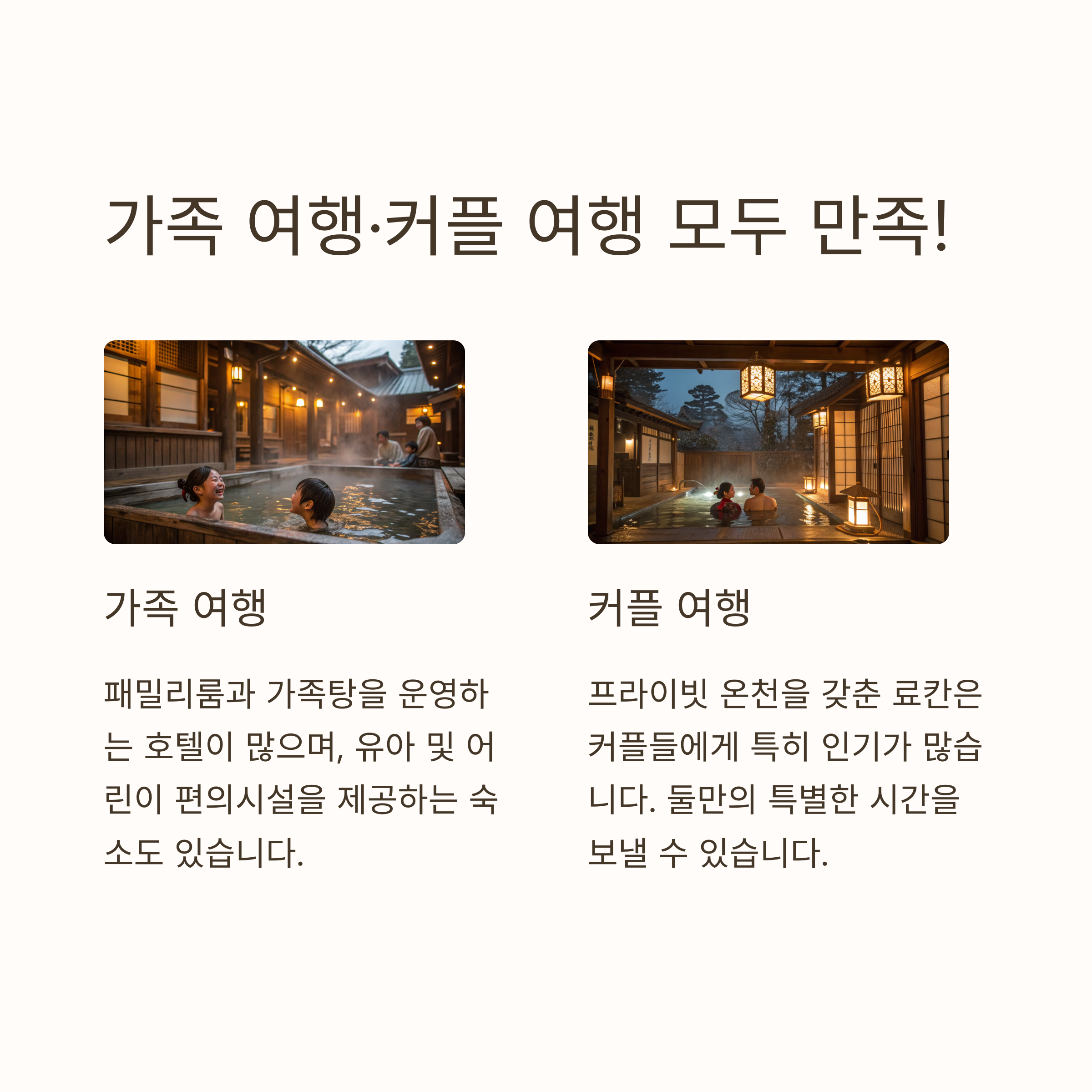 여행 스타일에 따라 숙소의 성격은 달라질 수 있습니다. 이동 편의성과 가성비를 중시한다면 비즈니스 호텔, 여유로운 힐링과 오션뷰를 원한다면 고급 료칸이 적합합니다. 특히 가족탕, 노천탕, 일본식 정식요리 등이 포함된 료칸은 전통 온천 여행의 진수를 느낄 수 있어 최근 여행객 사이에서 각광받고 있습니다.